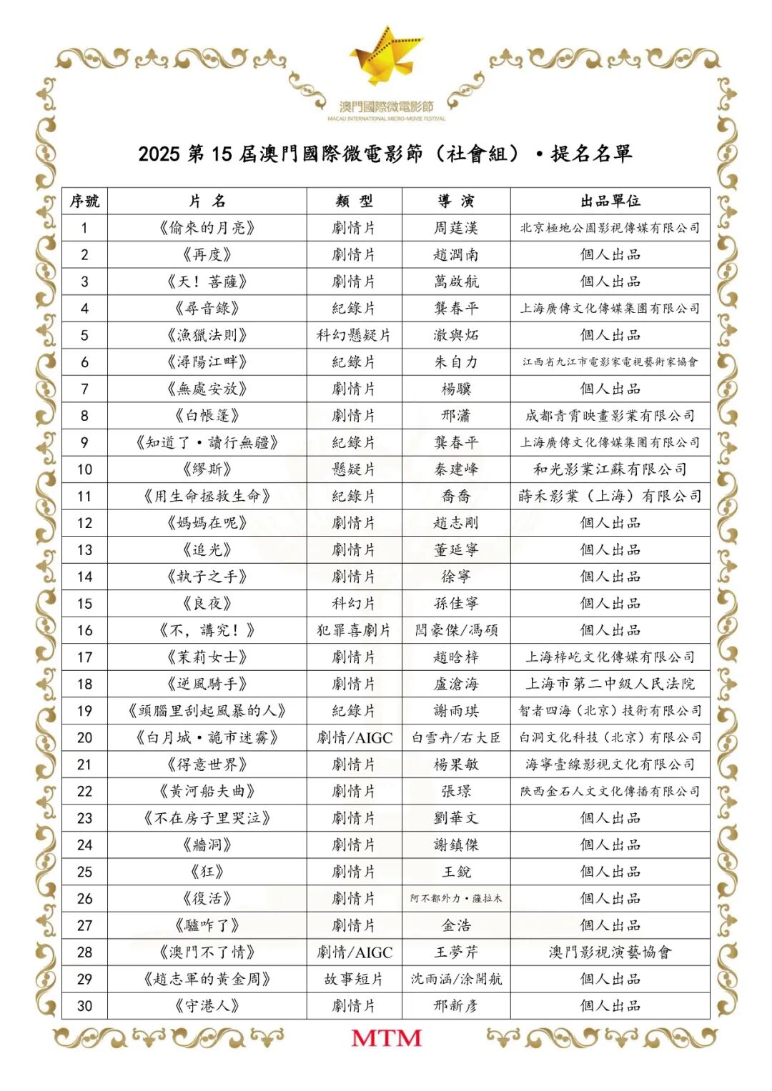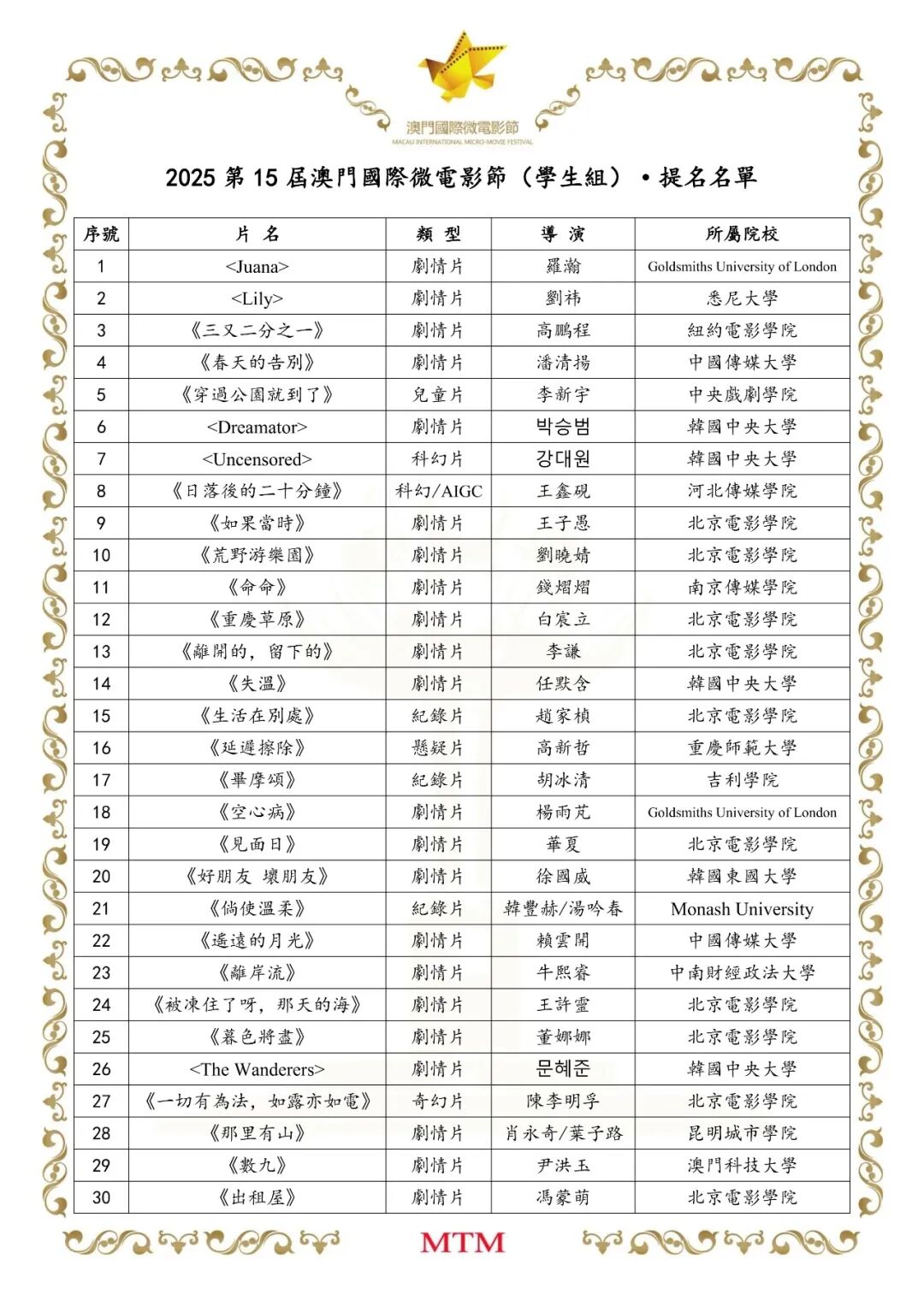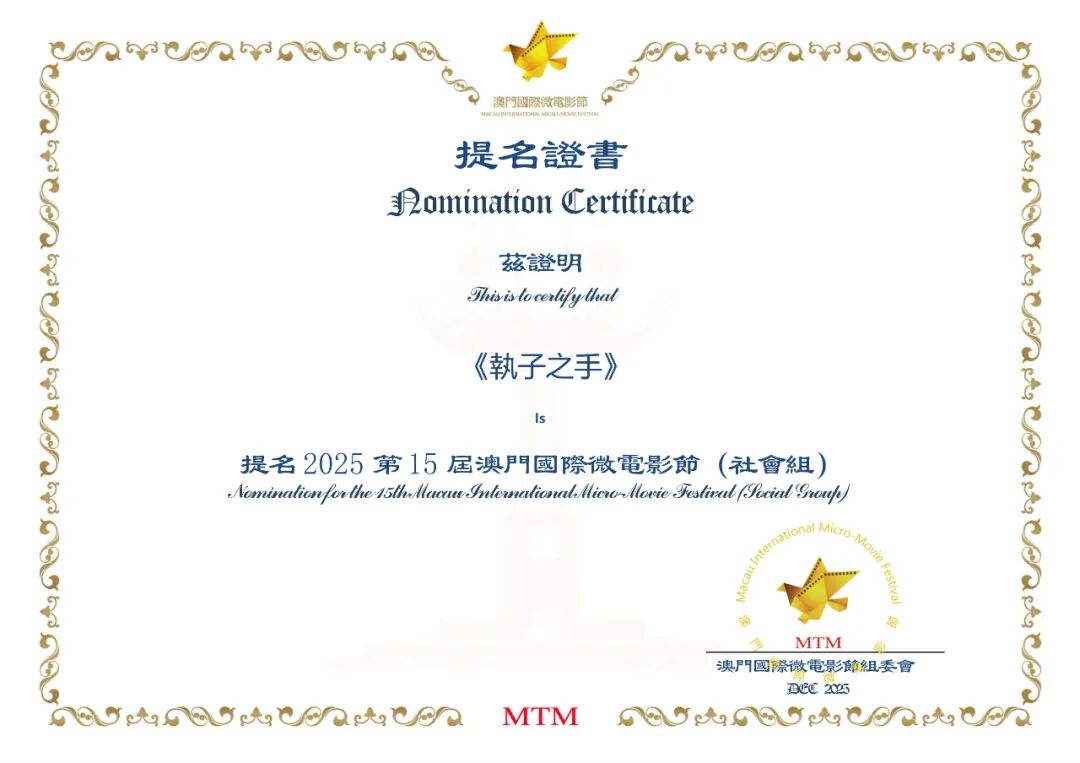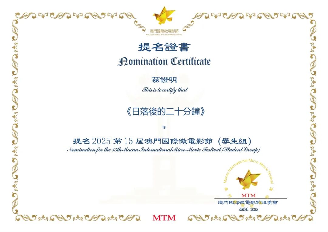 近日,第15届澳门国际微电影节提名名单正式揭晓,由河北传媒学院姚婉莉编剧、徐宁执导的短片《执子之手》获“社会组”提名,由白倩雨指导、2021级戏剧影视文学专业王鑫砚导演的短片《日落后的二十分钟》荣膺学生组提名。