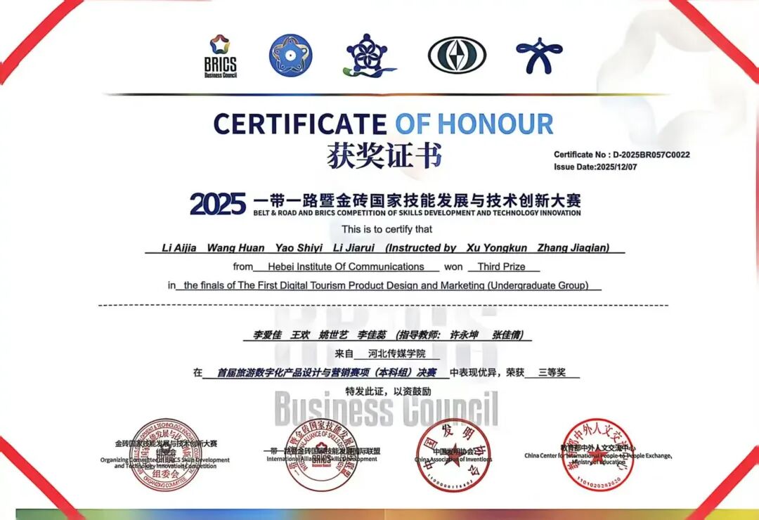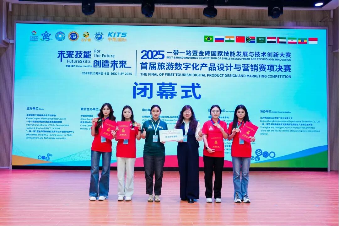 近日,2025“一带一路”暨金砖国家技能发展与创新技术大赛首届旅游数字化产品设计与营销赛项全国总决赛在海南经贸职业技术学院圆满收官。由河北传媒学院2022级和2023级电子商务专业的4名学生组成的参赛团队,在文化产业管理学院两位指导教师的全程带领下,历经三天激烈角逐,最终斩获全国总决赛三等奖,以扎实的专业实力在全国舞台上展现了河传学子的风采。