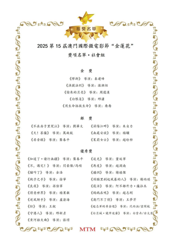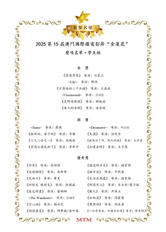 澳门国际微电影节由澳门电影电视传媒协会创办,是澳门历史最悠久、最具权威性和专业性的国际性微电影节之一。本届电影节吸引了来自全球多个国家与地区的数千部作品参与角逐,竞赛单元涵盖剧情片、纪录片、实验短片等多个门类,竞争异常激烈。我校两部作品凭借鲜明的主题表达、精湛的艺术创作脱颖而出,成功斩获重要奖项,展现了我校影视教育的深厚底蕴和创新成果。