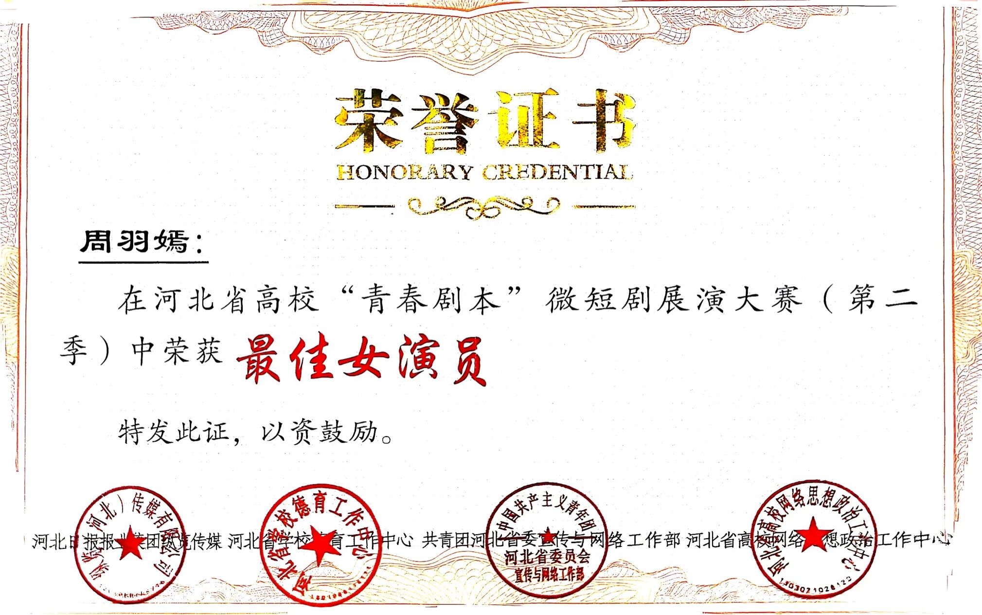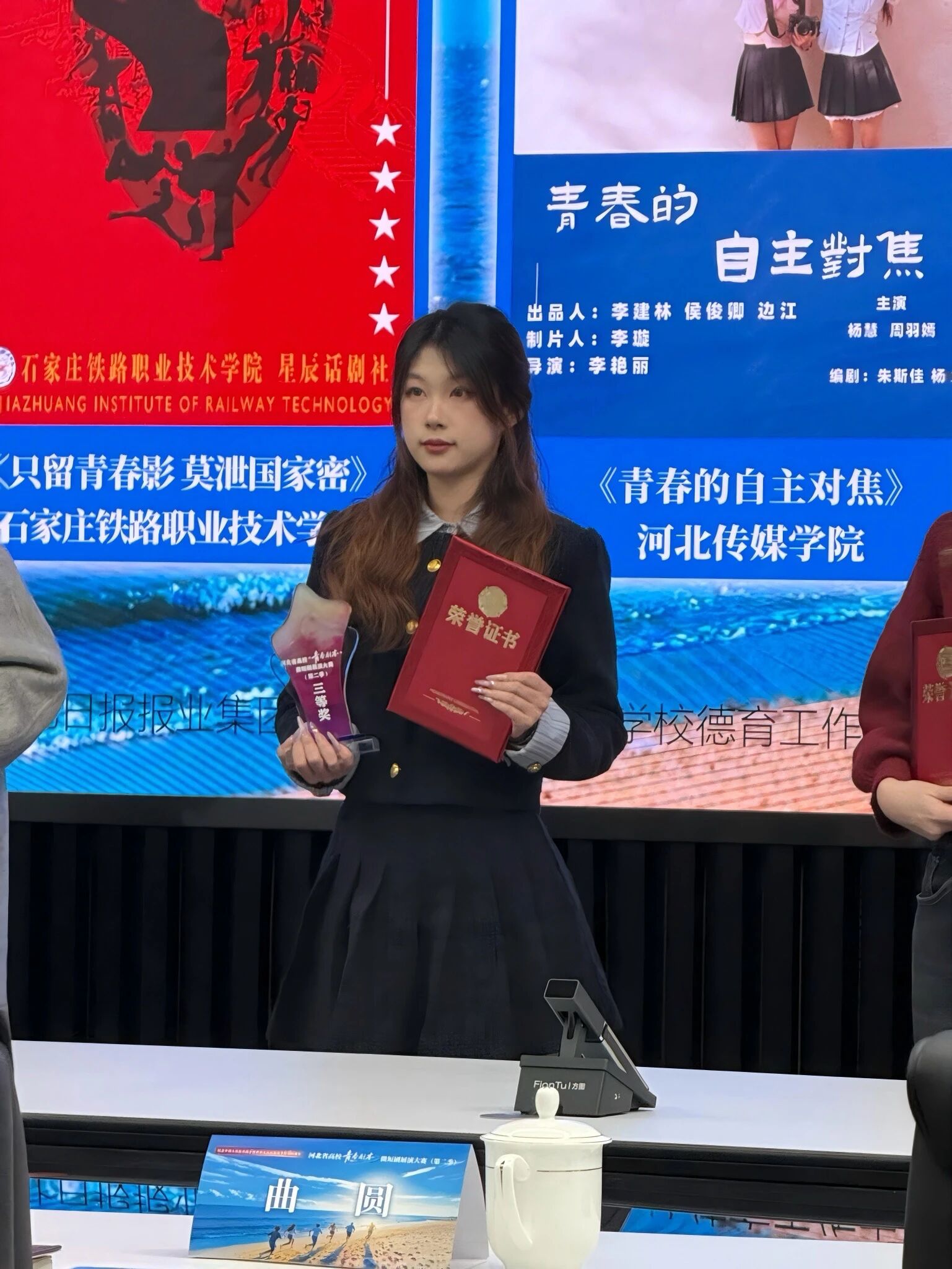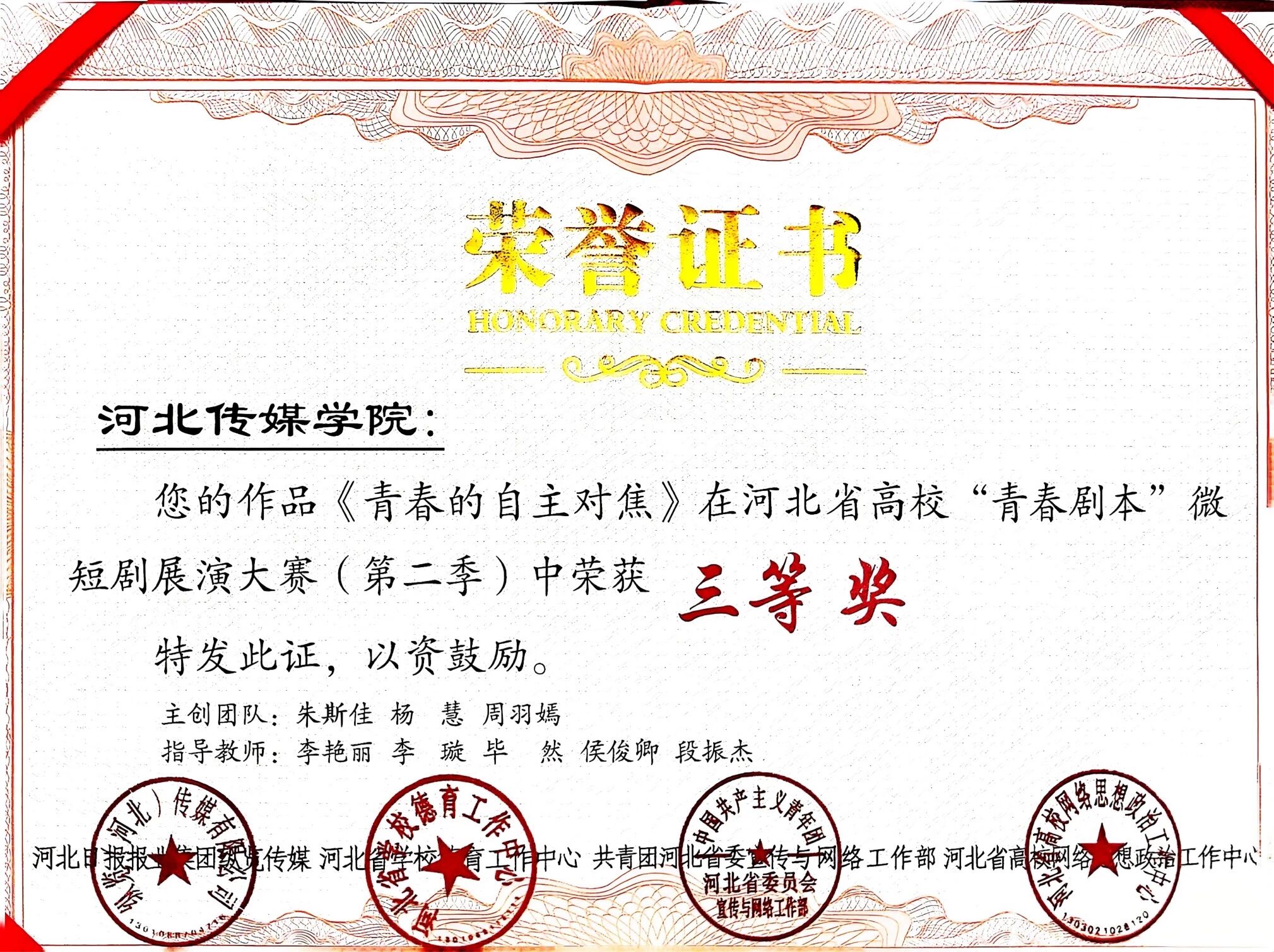 近日,由河北日报纵览新闻主办的河北省高校“青春剧本”微短剧展演大赛第二季圆满落幕。作为河北省内极具影响力的高校校园文化交流品牌赛事,本届大赛聚焦青年创作力量,深度挖掘青年创作潜力,积极推动校园微短剧创作生态繁荣发展,吸引了全省众多高校优秀创作团队携精品佳作踊跃参赛、同台竞技。在激烈角逐中,我校流行音乐专业师生团队凭借原创微短剧《青春的自主对焦》一举斩获大赛三等奖,剧中主演周羽嫣同学荣获最佳女主角奖项,以扎实的专业功底与出色的创作实力,充分彰显了我校音乐剧专业的教学水平与育人成效。