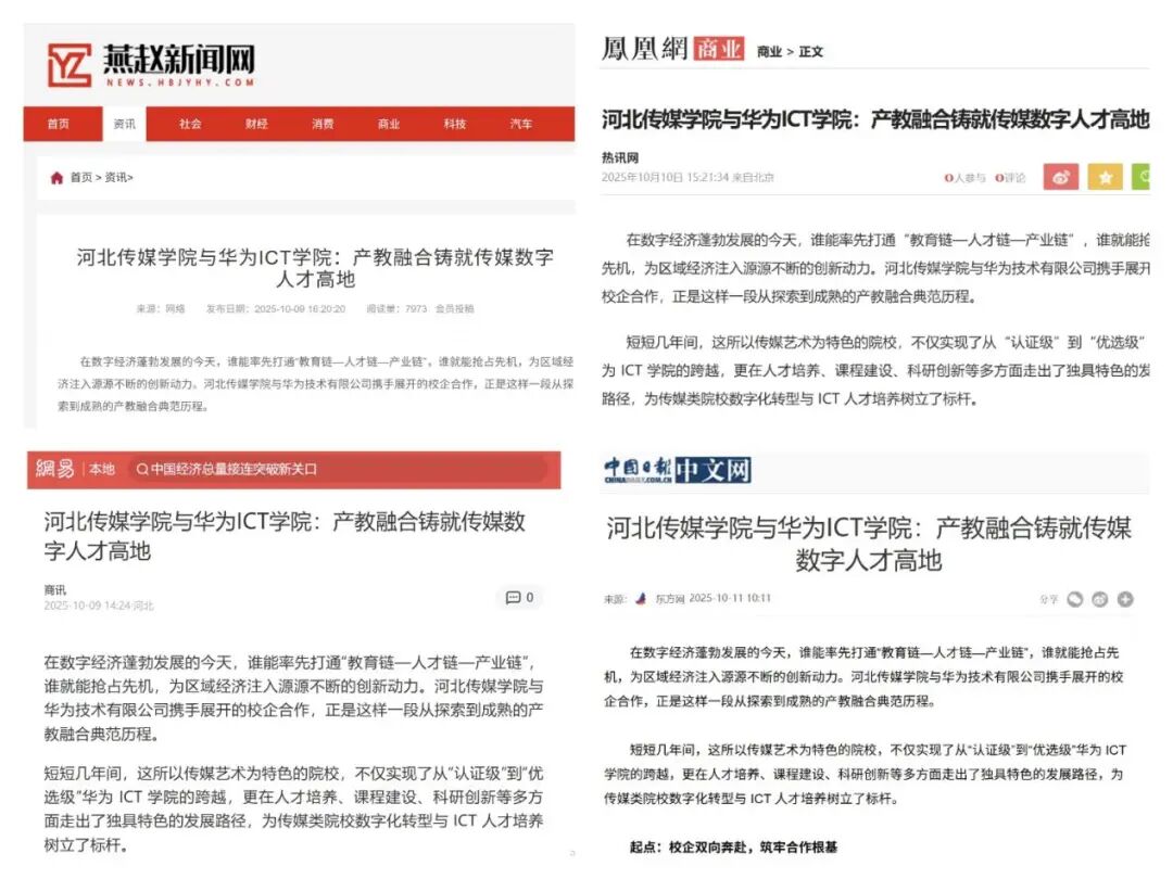 近日,河北传媒学院人工智能学院因与华为公司产教融合成果显著,获中国日报、凤凰网、燕赵新闻网、网易河北等多家主流媒体关注报道。