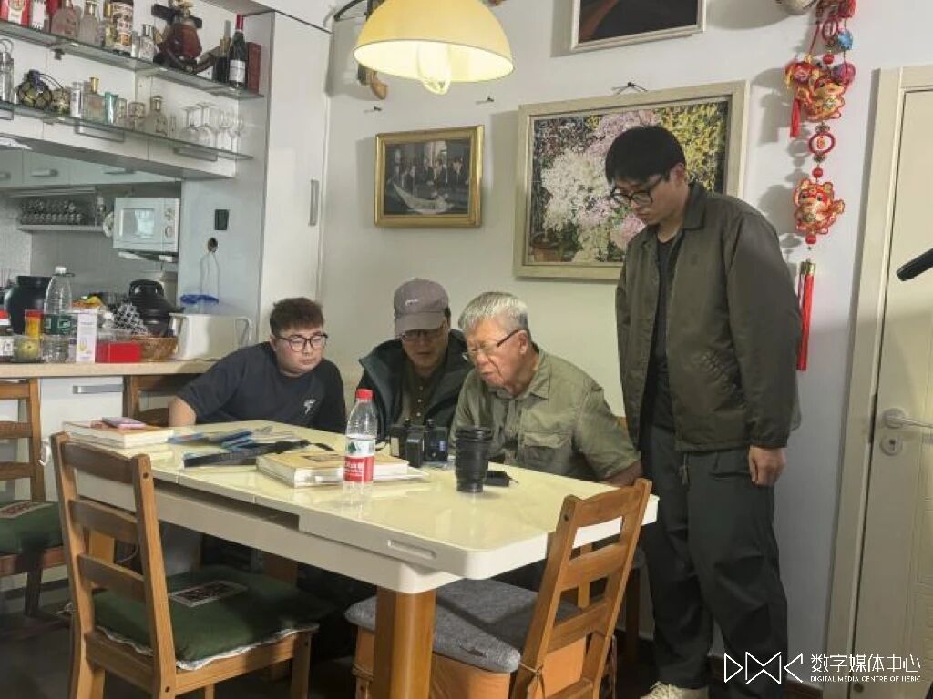 工作照1:总导演赵伟东(左二)、周波、李昶和常书鸿之子常嘉煌审看素材